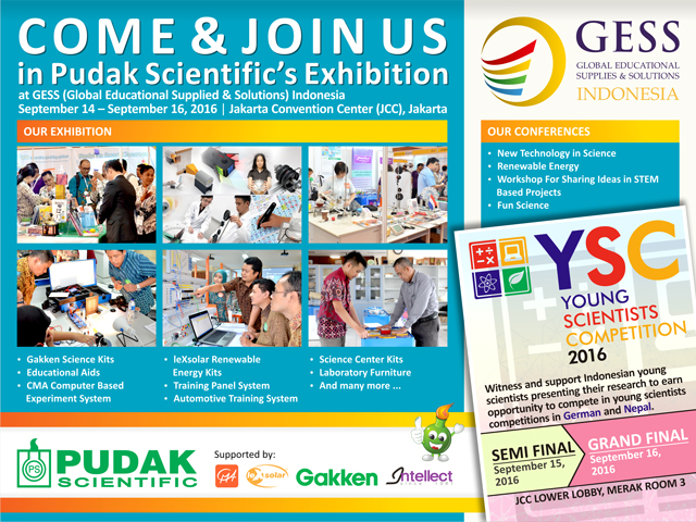 GESS Indonesia will be held again at Jakarta Convention Center (JCC), Jl. Jendral Gatot Subroto, Senayan, Jakarta; on September 14-16, 2016; at 9 a.m. – 5 p.m. Western Indonesian Time and Pudak Scientific will participate again.
